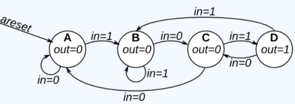 假设 one-hot 编码,通过检查导出状态转换和输出逻辑方程。仅实现此状态机的状态转换逻辑和输出逻辑(组合逻辑部分)。 (testbench将使用非独热码输入进行测试,以确保您不会尝试做更复杂的事情)。
