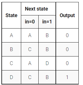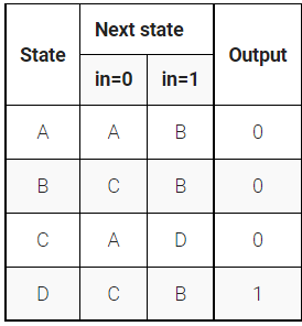 下面是一输入一输出四状态的摩尔状态机的状态转移表。实现这个状态机。包括将 FSM 同步复位为状态 A 。