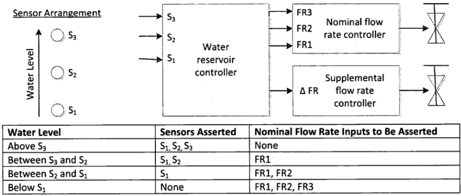 一个大水库供几个用户用水。为了保持水位足够高,三个传感器以5英寸的间隔垂直放置。当水位高于最高传感器(S3)时,输入流量为零。当水位低于最低传感器(S1)时,流量应在最大(标称流量FR和补充流量dFR都打开)。当水位在上下传感器之间时,流量由两个因素决定:水位和上一个传感器变化前的水位。每个水位都有一个与之相关的标称流量(FR),如下表所示。如果传感器的变化表明先前的水位低于当前的水位,则标称流量应该放在适当的位置。如果先前的水位高于当前的水位,应通过打开补充流量阀(由dFR控制)来增加流量。画出水库控制器的摩尔状态机的转换图。清楚地指出每个状态的所有状态转换和输出。FSM的输入为S1、S2、S3;输出是FR1、FR2、 FR3和dFR。