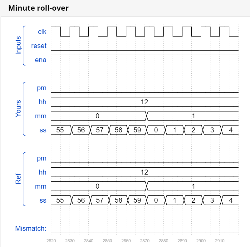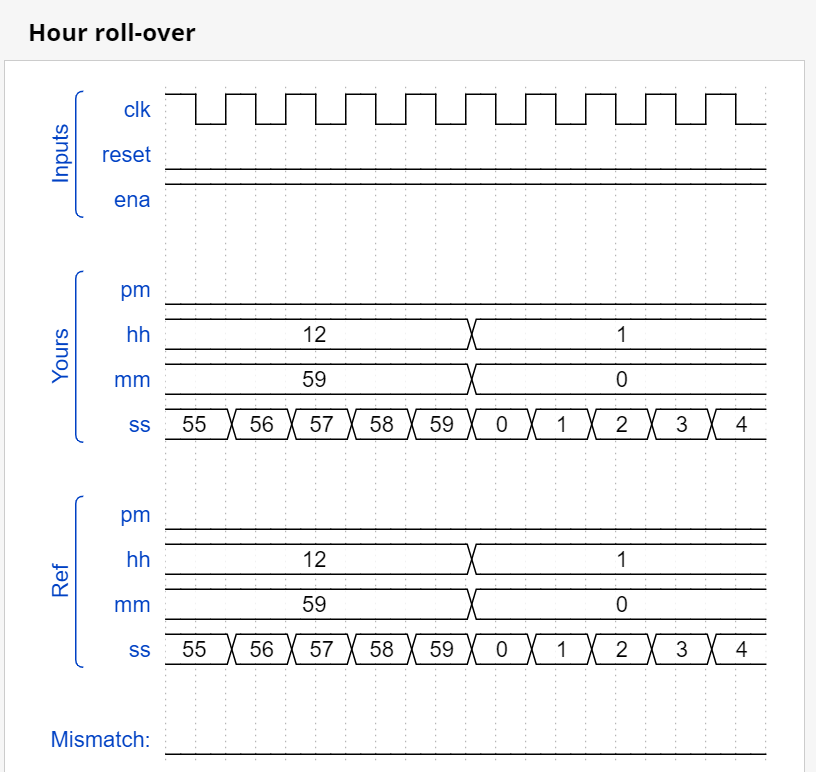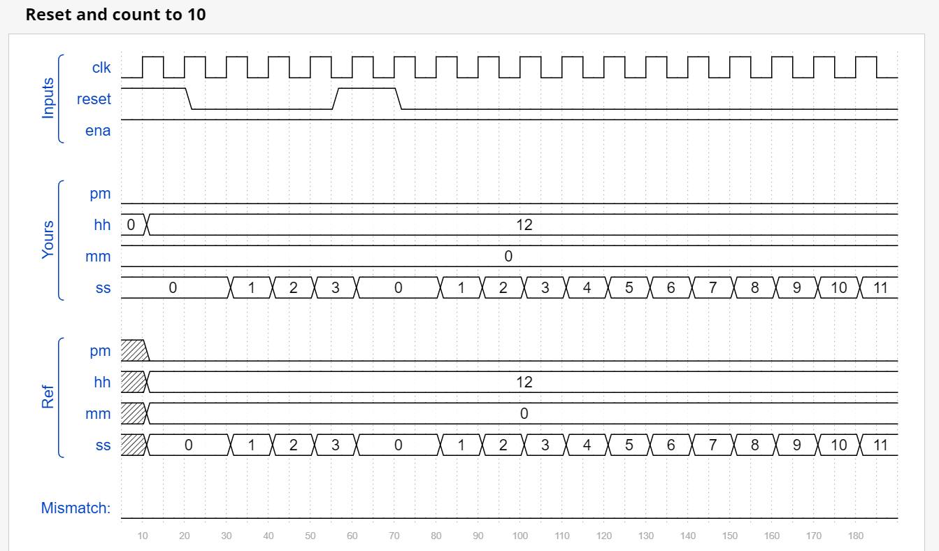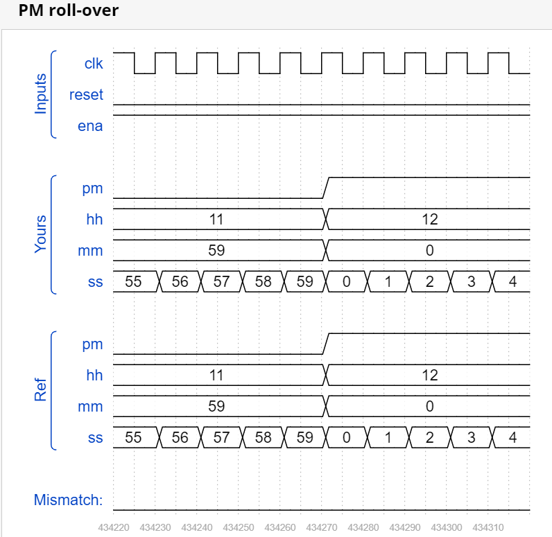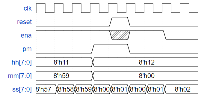- 有复位信号,且复位的优先级高于使能端,复位信号有效时能复位到12点,其中pm 表示 AM 为 0,PM 为 1。