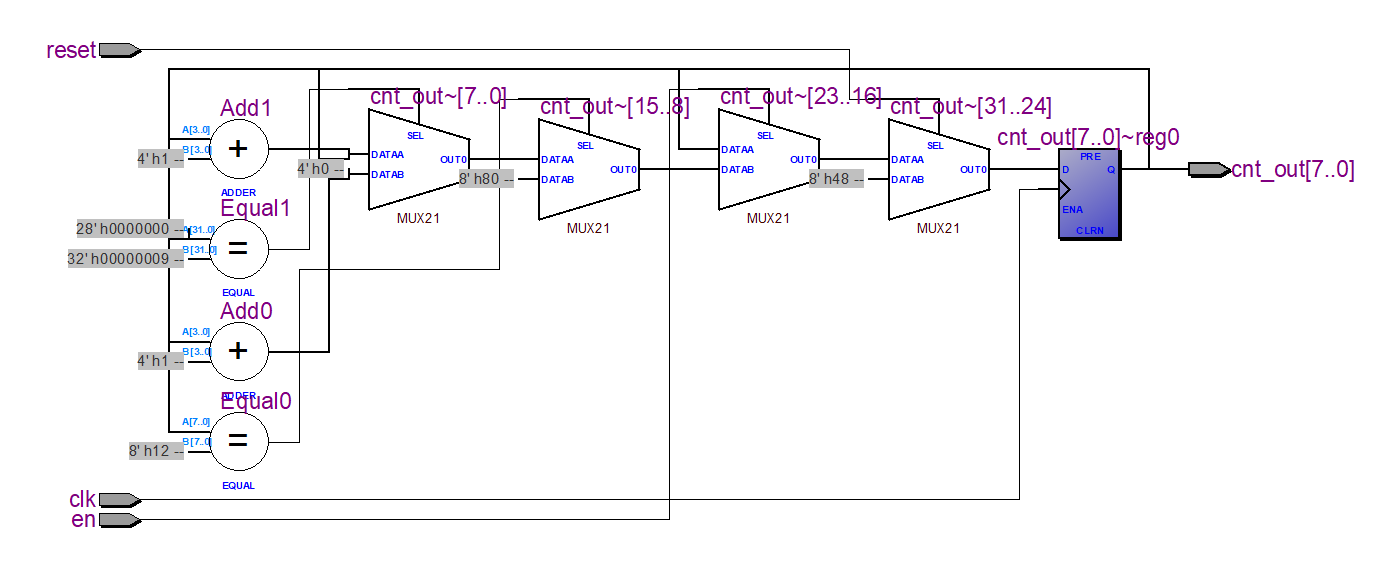 创建一组适合用作 12 小时制的计数器(带 am/pm 指示器)。您的计数器由快速运行的clk计时,只要您的时钟应该增加(即每秒一次),就会在ena上发出脉冲。