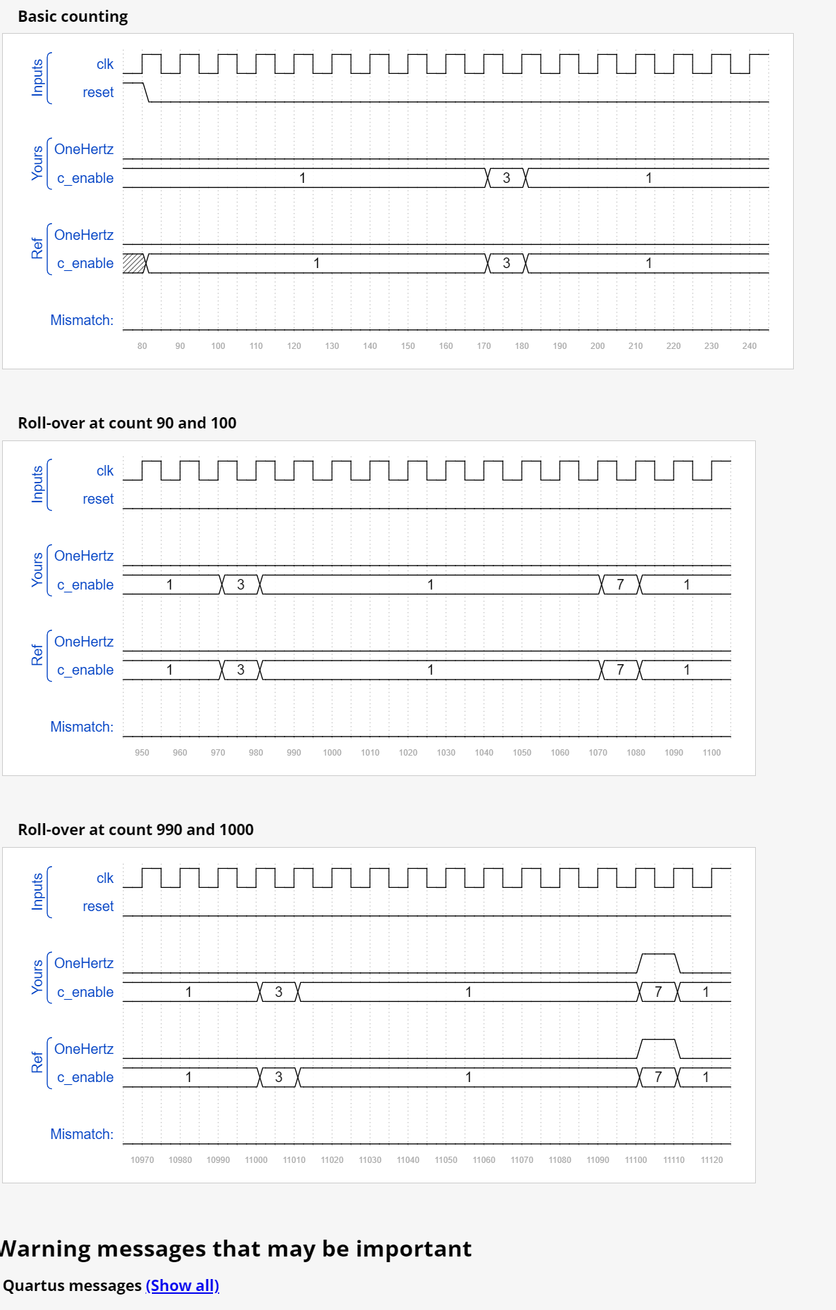 从 1000 Hz 时钟派生一个 1 Hz 信号(称为 OneHertz),该信号可用于驱动一组小时/分钟/秒计数器的 Enable 信号,以创建数字挂钟。由于我们希望时钟每秒计数一次,因此必须每秒精确地置位一个周期的一赫兹信号。使用模 10 (BCD) 计数器和尽可能少的其他门构建分频器。同时输出来自您使用的每个BCD计数器的使能信号(c_enable[0]表示最快的计数器,c_enable[2]表示最慢的计数器)。