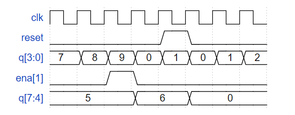 构建一个 4 位数的 BCD(二进制编码的十进制)计数器。每个十进制数字使用4位进行编码:q[3:0]是1位,q[7:4]是十位,依此类推。对于数字 [3:1],还要输出一个使能信号,指示上三位数字中的每一位何时应递增。