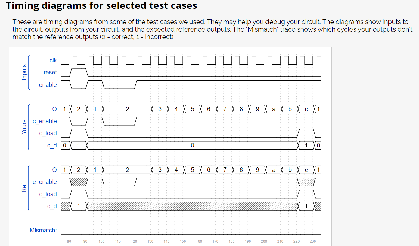 - c_enable、c_load、c_d[3:0]控制信号进入提供的4位计数器,因此可以验证正确的操作。