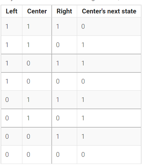 There is a one-dimensional array of cells (on or off). At each time step, the state of each cell changes. In Rule 110, the next state of each cell depends only on itself and its two neighbours, according to the following table: