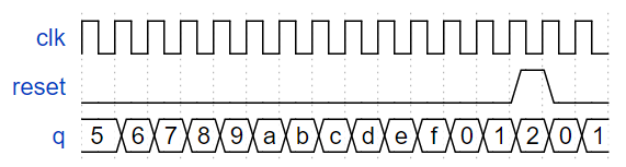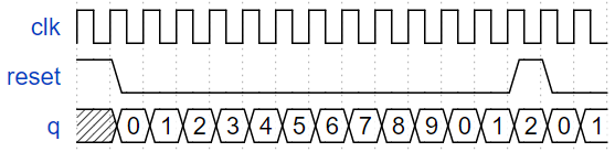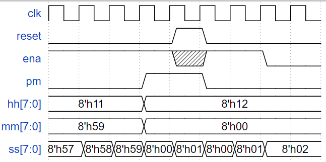 clk, with a pulse onenawhenever your clock should increment (i.e., once per second).resetresets the clock to 12:00 AM.pmis 0 for AM and 1 for PM.hh,mm, andssare two BCD (Binary-Coded Decimal) digits each for hours (01-12), minutes (00-59), and seconds (00-59). Reset has higher priority than enable, and can occur even when not enabled.The following timing diagram shows the rollover behaviour from