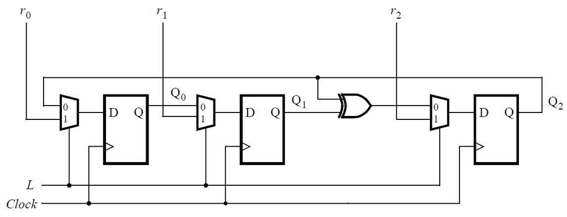 module top_module ( input [2:0] SW, // R input [1:0] KEY, // L and clk output [2:0] LEDR); // Q always@(posedge KEY[0]) begin if(KEY[1]) begin LEDR[0] <= SW[0]; LEDR[1] <= SW[1]; LEDR[2] <= SW[2]; end else begin LEDR[0] <= LEDR[2]; LEDR[1] <= LEDR[0]; LEDR[2] <= LEDR[2] ^ LEDR[1]; end end endmodule