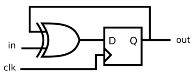 module top_module ( input clk, input in, output out); always @(posedge clk) begin out <= in^out; end endmodule