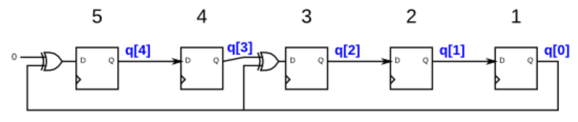 The following diagram shows a 5-bit maximal-length Galois LFSR with taps at bit positions 5 and 3. (Tap positions are usually numbered starting from 1). Note that I drew the XOR gate at position 5 for consistency, but one of the XOR gate inputs is 0.