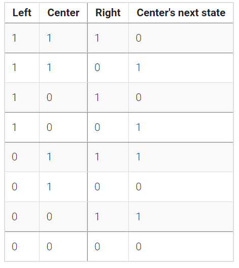 The rules are simple. There is a one-dimensional array of cells (on or off). At each time step, the next state of each cell is the XOR of the cell’s two current neighbours. A more verbose way of expressing this rule is the following table, where a cell’s next state is a function of itself and its two neighbours: