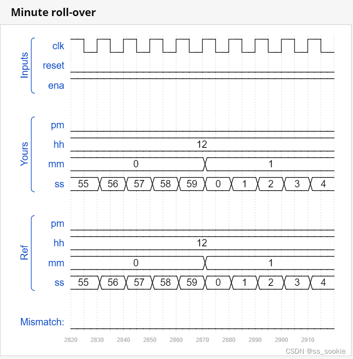 The following timing diagram shows the rollover behaviour from 11:59:59 AM to 12:00:00 PM and the synchronous reset and enable behaviour.