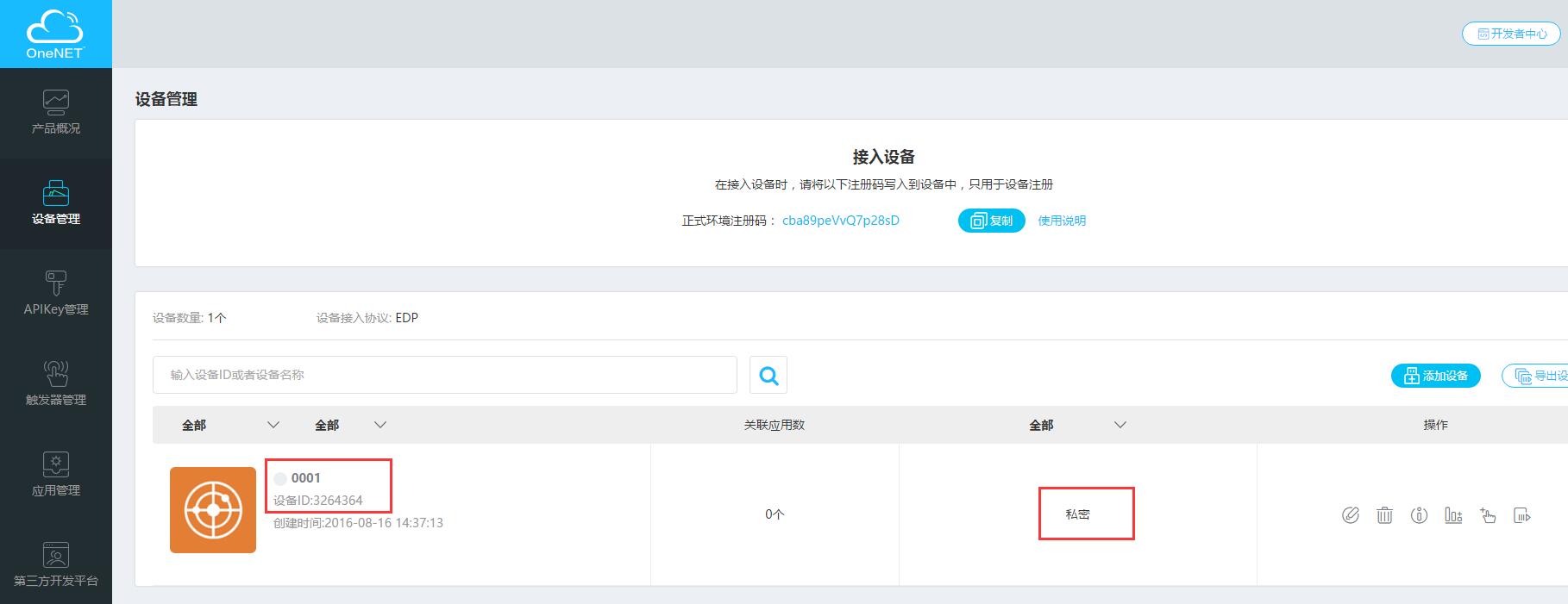 产品下有一个新增设备,名称为0001,ID为