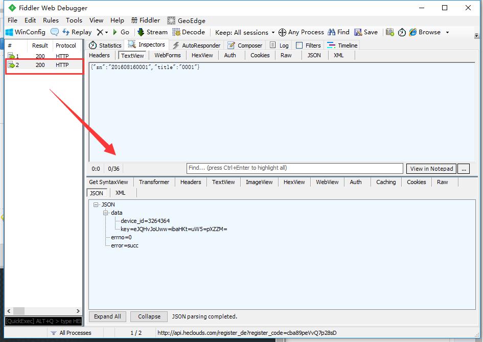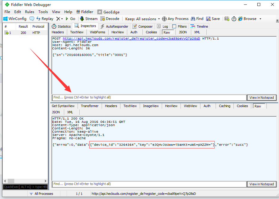 2、以注册码和设备唯一标识(SN)为参数(设备名为可选),调用api,获取设备ID以及设备KEY