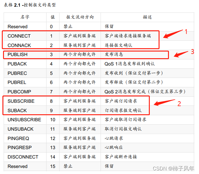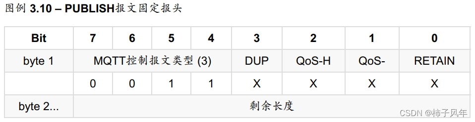 特别的,其中DUP标志位表示是否是重发,即为1时表示该报文是重发,但只对于QoS等级1和2才生效,且QoS为0时后4bit必须全部置0。