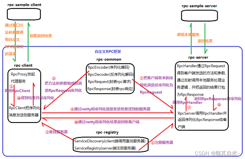 与1.3架构图相比较,rpc-sample-client相当于client-functions,通过接口方法发起请求;而rpc-client相当于client-stub,负责把方法和参数序列化并发送给查找到的服务器。rpc-server相当于server stub,负责把客户端发送过来的消息反序列化,并通过反射调用本地服务,再把本地服务返回的结果序列化发送给客户端;rpc-sample-server则相当于server-functions,提供本地服务并返回得出的结果给rpc-server。rpc-client等待接收rpc-server返回的结果,并将结果反序列化,再把反序列化最终得到的结果返回给rpc-sample-client。