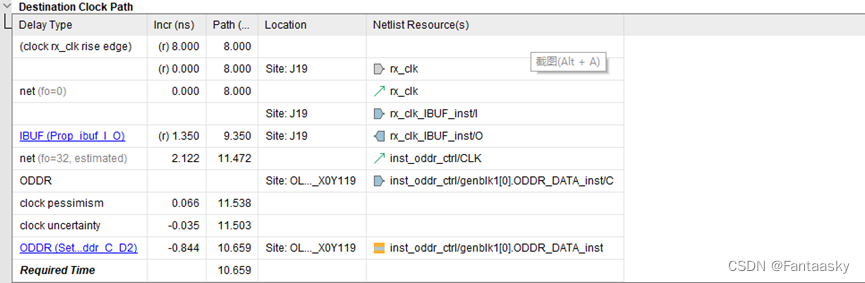 目的端时延特征。可以看到前面有和源端时延特征一样的几项:第一个net和IBUF,这几项就是共同路径的延迟。