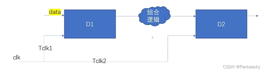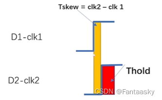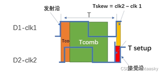 系统时钟通过wire和除法器D1和D2相连,线传输延时分别为Tclk1和Tclk2,这里为了计算方便,归一化为时间偏斜Tskew = Tclk2 – Tclk1。// 也就是下图的橙色部分
