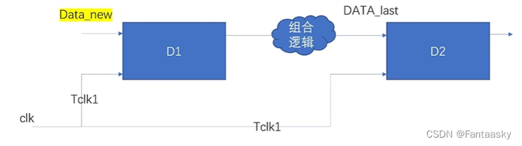 一段data刚出D1,经过一定延时到达D2的门口,然后基于clk2的上升沿完成了输出。这段旧的data被称为data_last。在不考虑Tskew的情况下,前一个触发器D1的触发信号clk1在clk2上升沿的同时也进入了上升沿。如果data_last没有保持稳定足够多的时间,那么data_new就会在很快的时间内把data_last给冲刷掉,然后成为新的输出。
