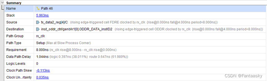 建立裕量setup slack和保持裕量hold slack必须维持在正数才能保证没有出现时序冲突。