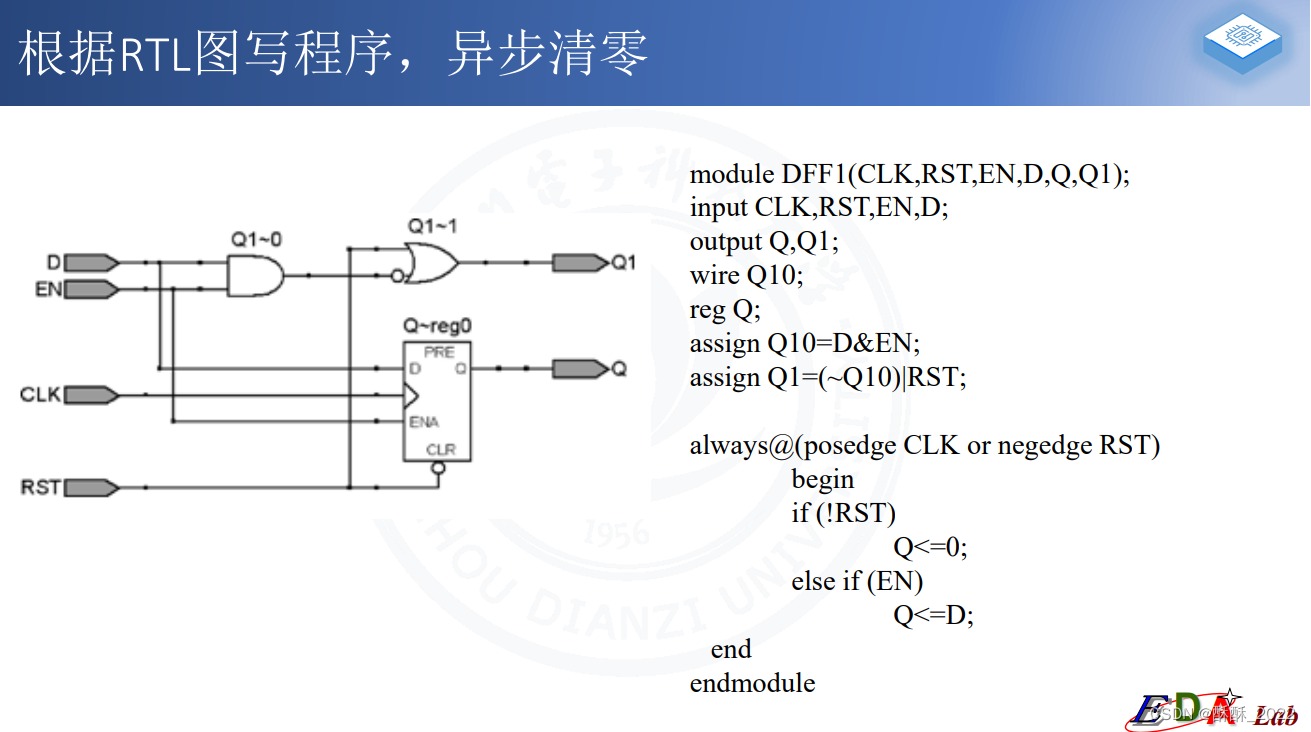 异步:在任意时刻,只要RST有效,D触发器输出立刻清零,与时钟clk状态无 关。