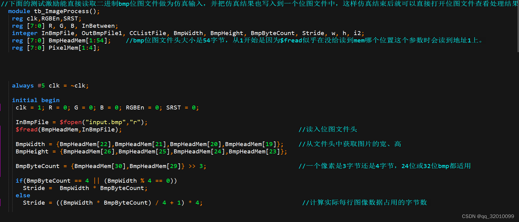 下面直接看代码。最先要说的是,在Verilog测试激励代码里,integer这个变量类型指的是32位整型,但它也可以用作指代一个打开的文件,就相当于一个文件指针或句柄吧。所以上面的代码中In Bmp File这个变量指代的就是我们要读入的测试输入位图文件。再来看深度为54的Bmp Head Mem这个寄存器数组,它就是用来存放要读入的位图文件前54个字节文件头的。把文件头读入存起来有两个原因:一是要从中获取图片的宽高信息,以及是24位还是32位。另一个原因是仿真输出要写入一个新建的输出位图文件中,这个位图文件也需要写入一个文件头啊,一般输出图像和输入是一样大的,那正好把输入文件的文件头写过去就可以了。
