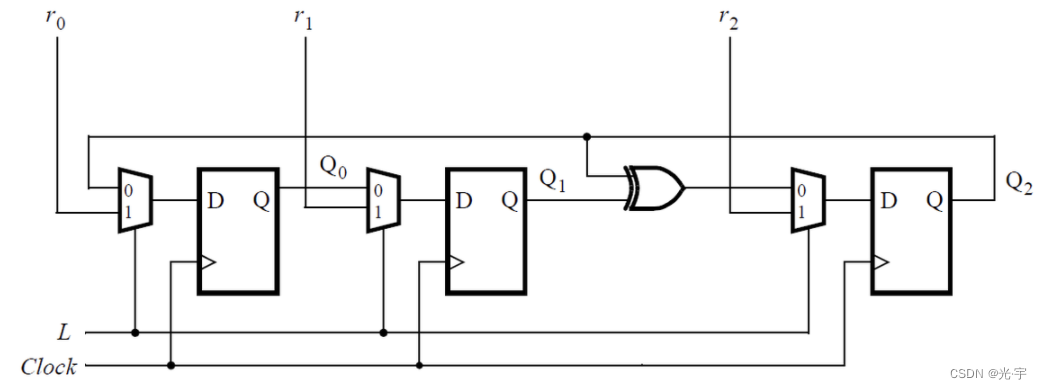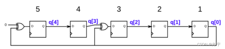 该电路是线性反馈移位寄存器(LFSR)的一个例子。最大周期LFSR可用于生成伪随机数,因为它在重复之前通过2n-1个组合循环。全零组合不会出现在这个序列中。