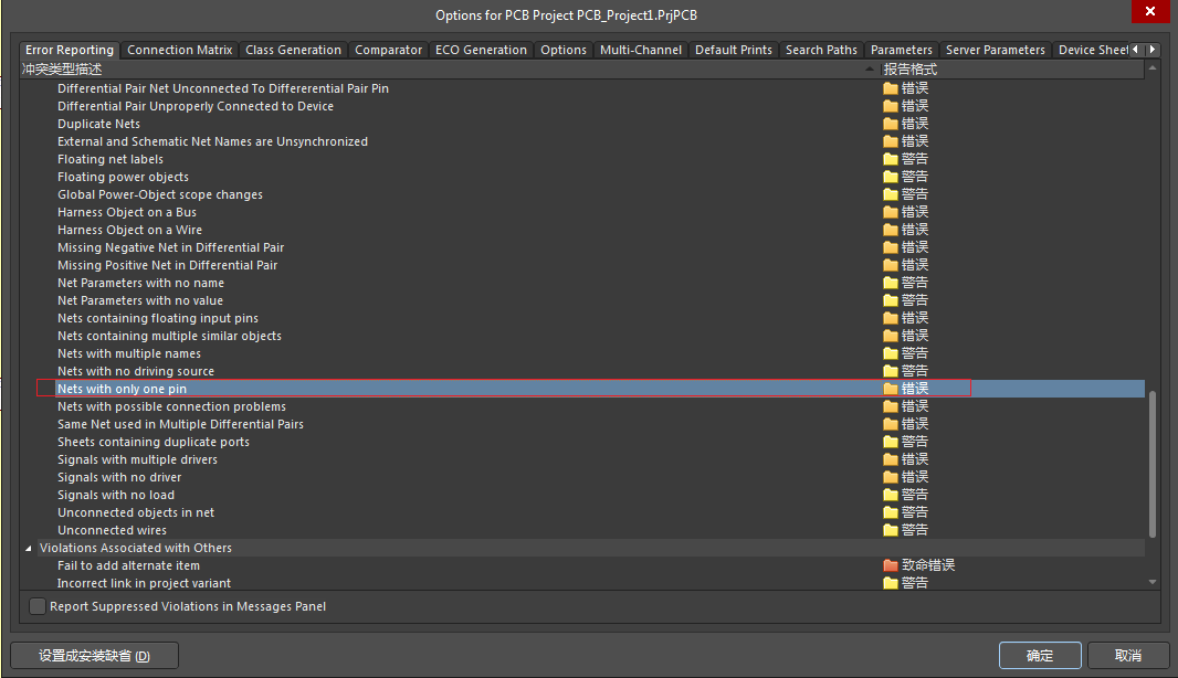 我直接 Project>Project Options>Error Reporting 界面下找到Nets With only one pin 选项,选择修改他的Report Mode模式,改为No RePort。