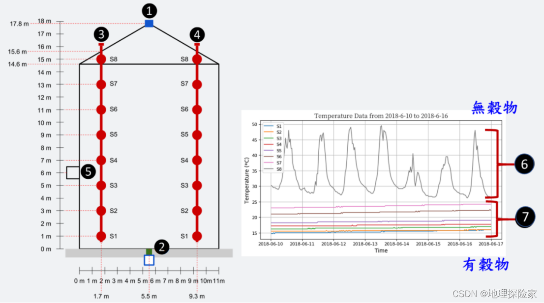 图七是低温谷仓中公粮监测的案例。一般谷物是从(1)进入谷仓、从(2)出料。透过既有的温度感测线(3)与(4)可以得知谷仓内的温度。若温度过高,则会从(5)将冷气吹入。因为温度传感器被谷物压到时温度变化不大(7);而没有谷物时,温度会随室外气温变化(6)。国立宜兰大学团队藉此设计系统,协助估测并监控公粮的储存量。