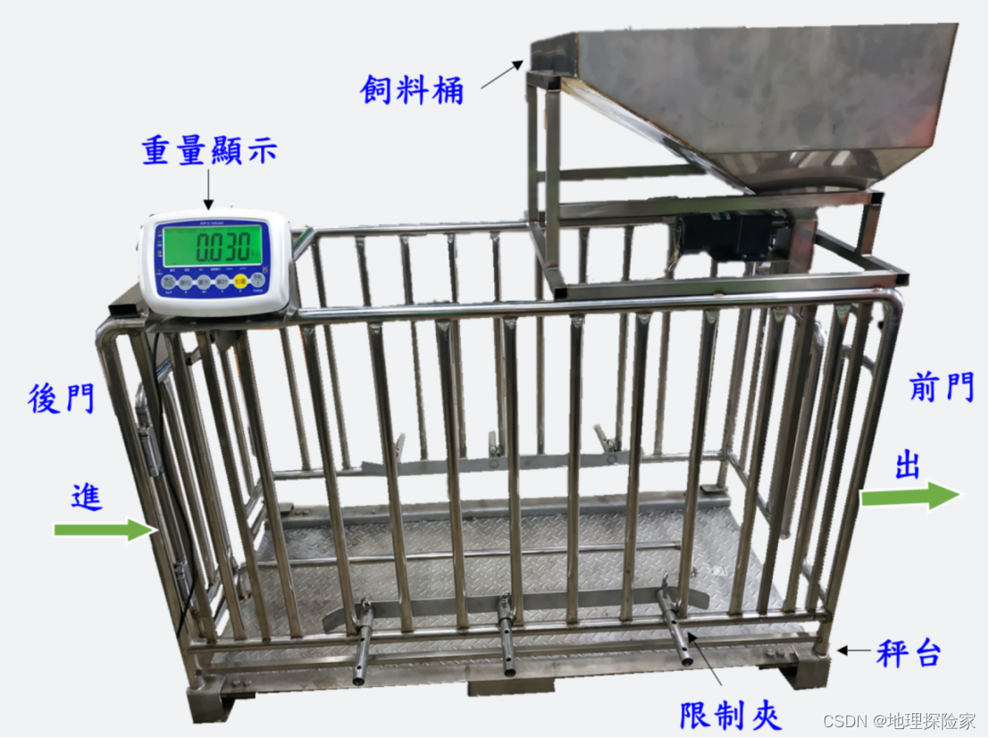图六是国立宜兰大学设计的猪只自动称重与喂食系统。当猪只站上秤台后系统开始运作。透过猪只身上的耳标(RFID),系统可以判定是那一头猪、纪录猪只重量,并自动判断是否需要给饲料。