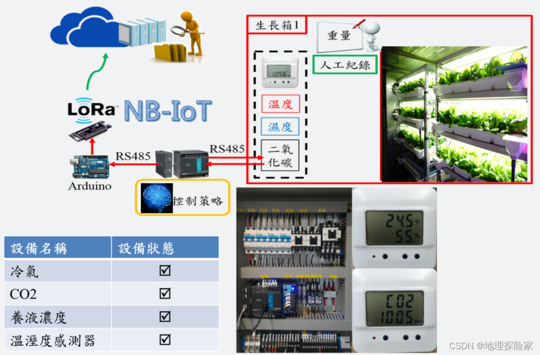 图四是大学植物工厂的案例。透过传感器可以侦测温湿度与二氧化碳,并控制冷气与养液。为了避免网络断线造成影响,有部份控制策略是放在PLC控制器中,透过RS-485界面连至微控制器,再将数据资料透过LoRa或NB-IoT送至云端。