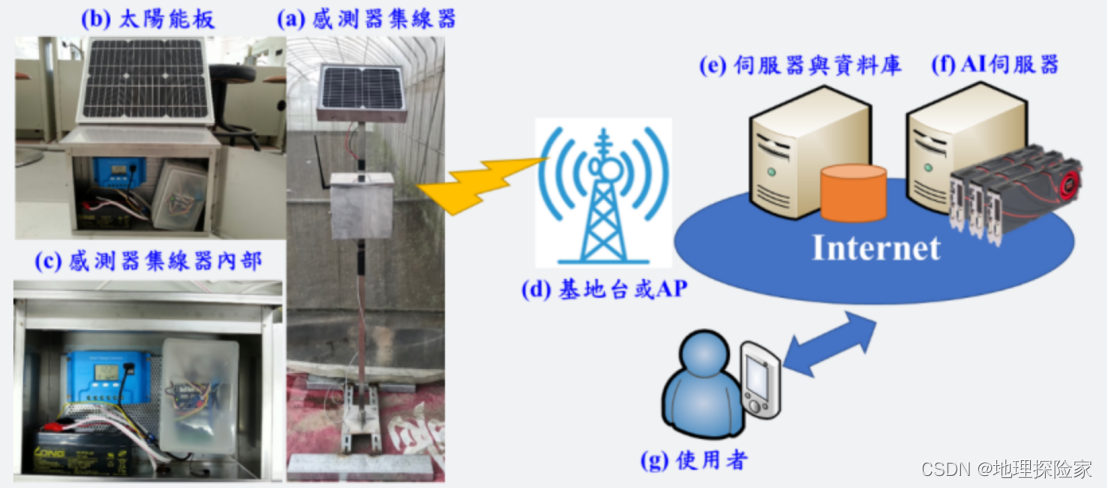 图二是一个侦测风向与风速对授粉及植物生长的影响的范例。风向与风速传感器(a)可以实时测得风向与风速。透过光量传感器(b)得知光子的数量,及温湿度(c)与土壤湿度与EC传感器(g)可以观测光合作用的重要指标。在农地中也要注意防水(d)与防虫(h)。