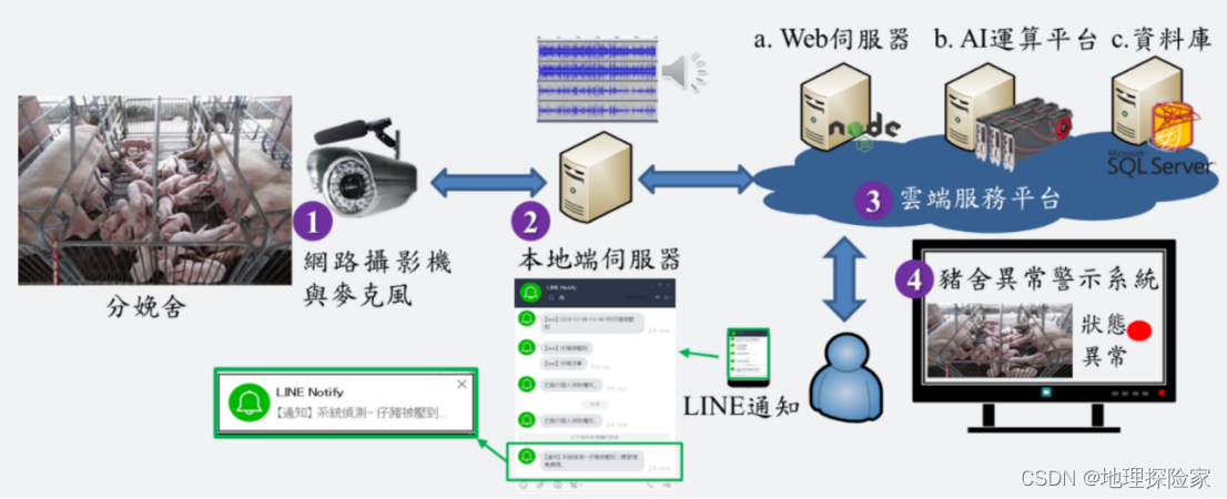图五是仔猪受压迫警示系统的架构图。仔猪在出生时很容易因为受母猪压迫窒息而死。仔猪受压迫时会发出尖叫声,农民需要实时前往将仔猪救起。在此系统中利用物联网收集仔猪在分娩舍中的声音与影像,透过AI训练后可判断仔猪受压迫的尖叫声。若发生尖叫声,系统会发出警报或LINE讯息通知猪农。