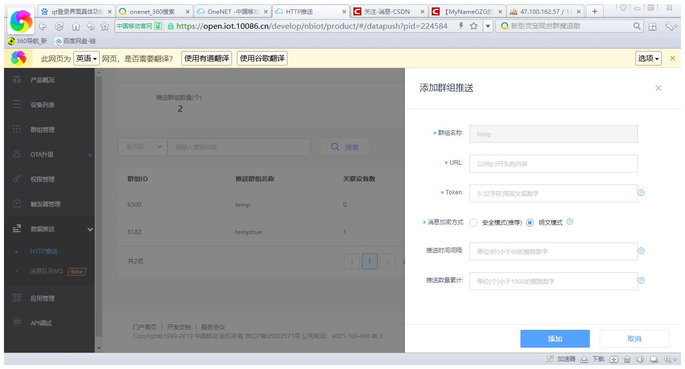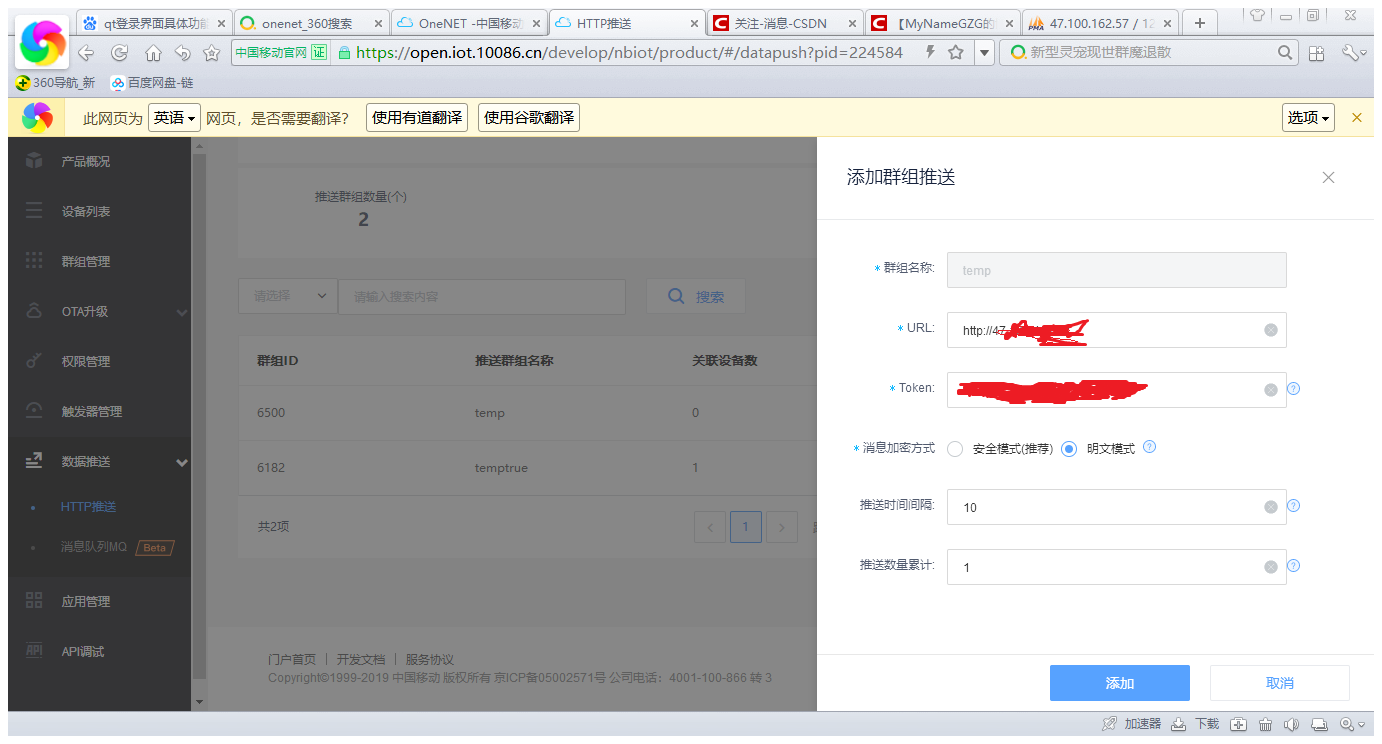 url填写自己的第三方服务器地址,,ToKen自己按个人喜好设置,消息加密选择明文即可,推送时间间隔和数据个数,可根据传感器上传数据的时间间隔设置,信息填好后点击添加,