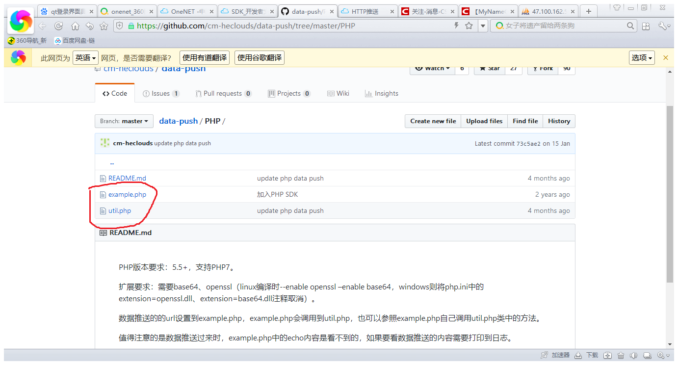 接下来按下点击下载,转到github,下载example.php,和util.php文件