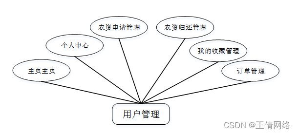 用户登陆后,主要可以对主页,个人中心,农资申请管理,农资归还管理,我的收藏管理,订单管理等功能进行操作管理。用户用例图如图3-2所示。