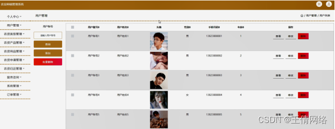 用户管理,在用户管理页面可以对用户账号,用户姓名,头像,性别,手机号码,年龄等内容进行查看,修改和删除等操作,如图5-9所示。