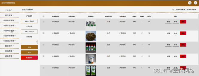 农资产品管理,在农资产品管理页面可以对产品编号,产品名称,产品图片,农资类型,产品特点,价格,单限,库存等内容进行查看,修改和删除等操作,如图5-11所示。