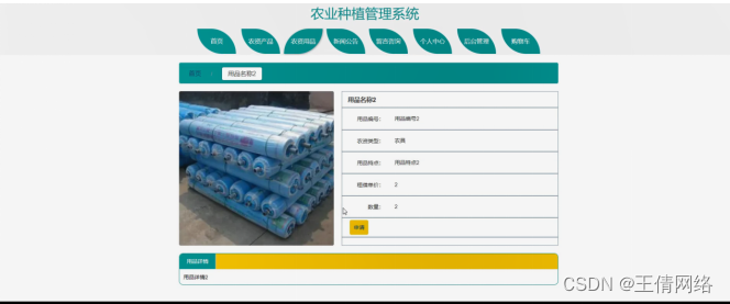 农资用品,在农资用品页面可以查看用品名称,用品编号,农资类型,用品特点,图片,租借单价,数量,用户详情等内容,并进申请操作,如图5-4所示。