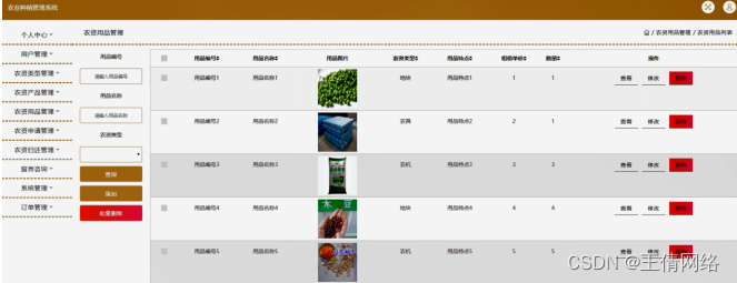 农资用品管理,在农资用品管理页面可以对用品编号,用品名称,用品图片,农资类型,用品特点,租借单价,数量等内容进行查看,修改和删除等操作,如图5-12所示。