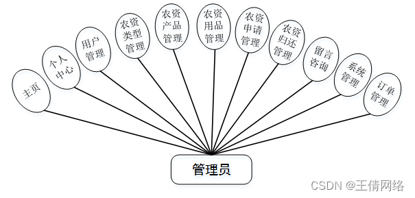 管理员登陆后,主要模块包括主页,个人中心,用户管理,农资类型管理,农资产品管理,农资用品管理,农资申请管理,农资归还管理,留言咨询,系统管理,订单管理等功能。管理员用例图如图3-1所示。