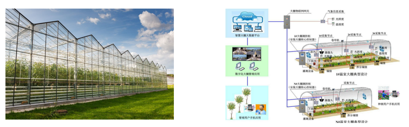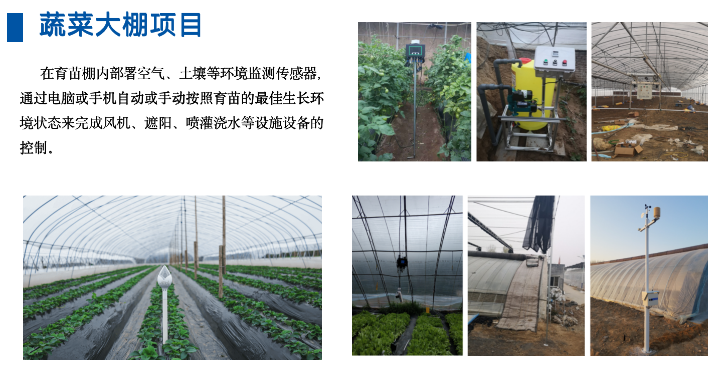 1. 通过建设物联网基站,实现对大棚、大田、畜牧场环境信息、土壤信息、作物长势信息的精准监测,用户使用条件控制、时间控制、单点控制设定作物全生命周期的生长环境参数阈值,实现对灌溉设备、卷帘、放风、补光、遮阳、保温、风机、喷雾、二氧化碳发生器等配套设备的精准控制。