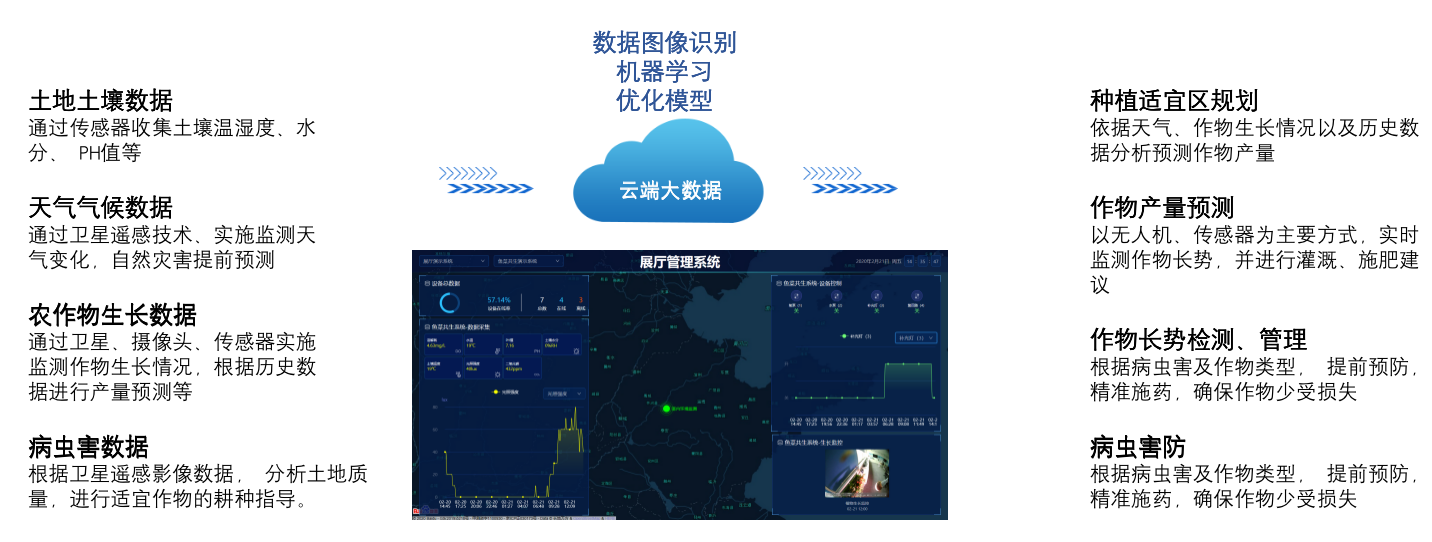 2. 整合相关种植经验及智慧产业大数据人工智能专利技术,形成针对农业种植需求模型、病虫害预警模型、水平衡模型、自然灾害监测预警模型、霜冻监测预警模型、瞬间高低温预警模型、大风预警和控制模型、本地小范围微环境七天预报模型,为种植经营提供精准高效的生产决策、设备设施智能调控和标准化种植专业指导,可用于指导生产且能够自主优化的模型分析系统,实现专家知识、种植经验、产业大数据的共享。
