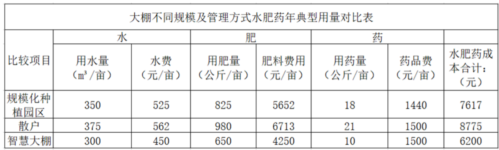 根据对某地种植园区和散户的调硏,常规方式管理的大棚与智慧大棚产品水肥药的年用量比较如下表所示: