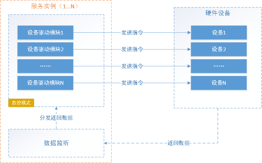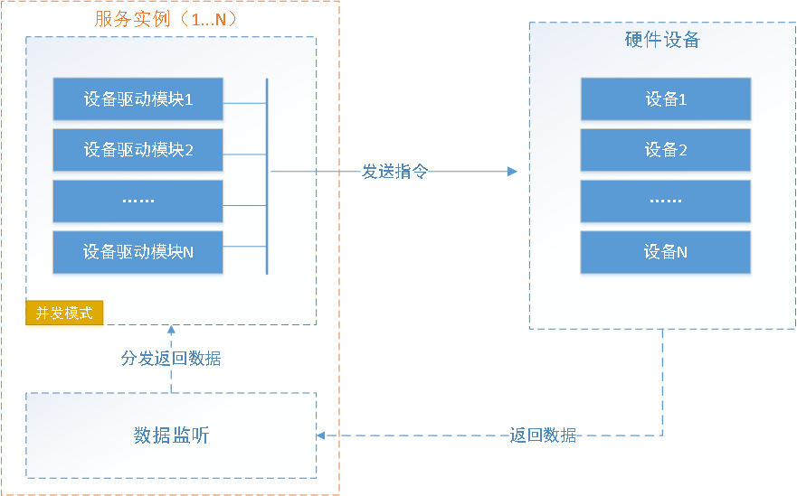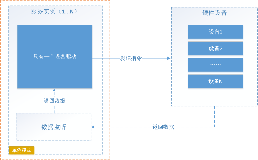 (4)单例模式:只有网络通讯时可以使用这种控制模式。在一个服务实例内只能有一个设备驱动,相当于一个设备驱动对应着N多个硬件设备终端。更适合通讯的数据协议有固定的标准,以命令关键字处理不同的数据。适用于高并发的硬件终端设备主动上传数据,服务器端根据数据信息进行处理和返回相应的数据。如下图: