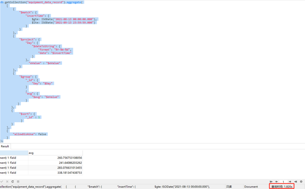 在实际的业务中,对一段时间内的数据进行分析是系统中很常见的一个操作。我们在MongoDB(对时间和设备编码建立了索引)和TDengine上都存储了3000万条数据,首先对全表进行时间区间数据分组统计查询,两种数据库的查询结果显示如下: