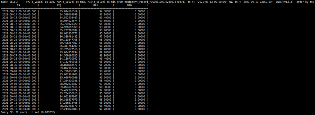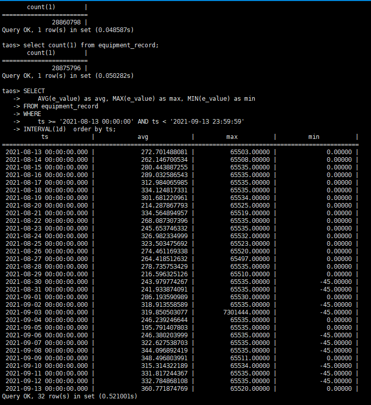 接下来对单个设备进行数据分组统计查询操作,两种数据库的查询结果如下图所示: