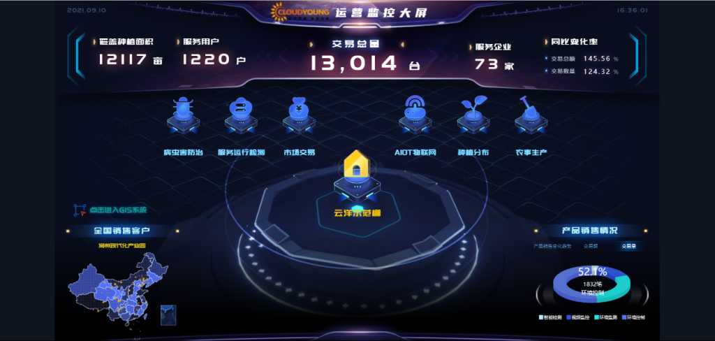 图1 云洋系统的运营监控大屏,图2为云洋系统的业务架构图,其中最下层设备层为边缘硬件设备,通过设备数据分发网关对设备实时数据进行定向分发。