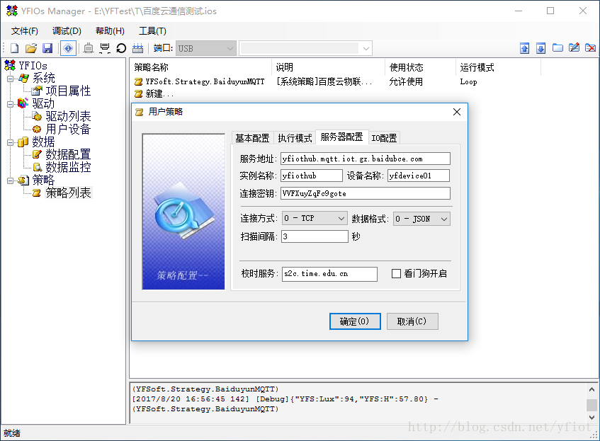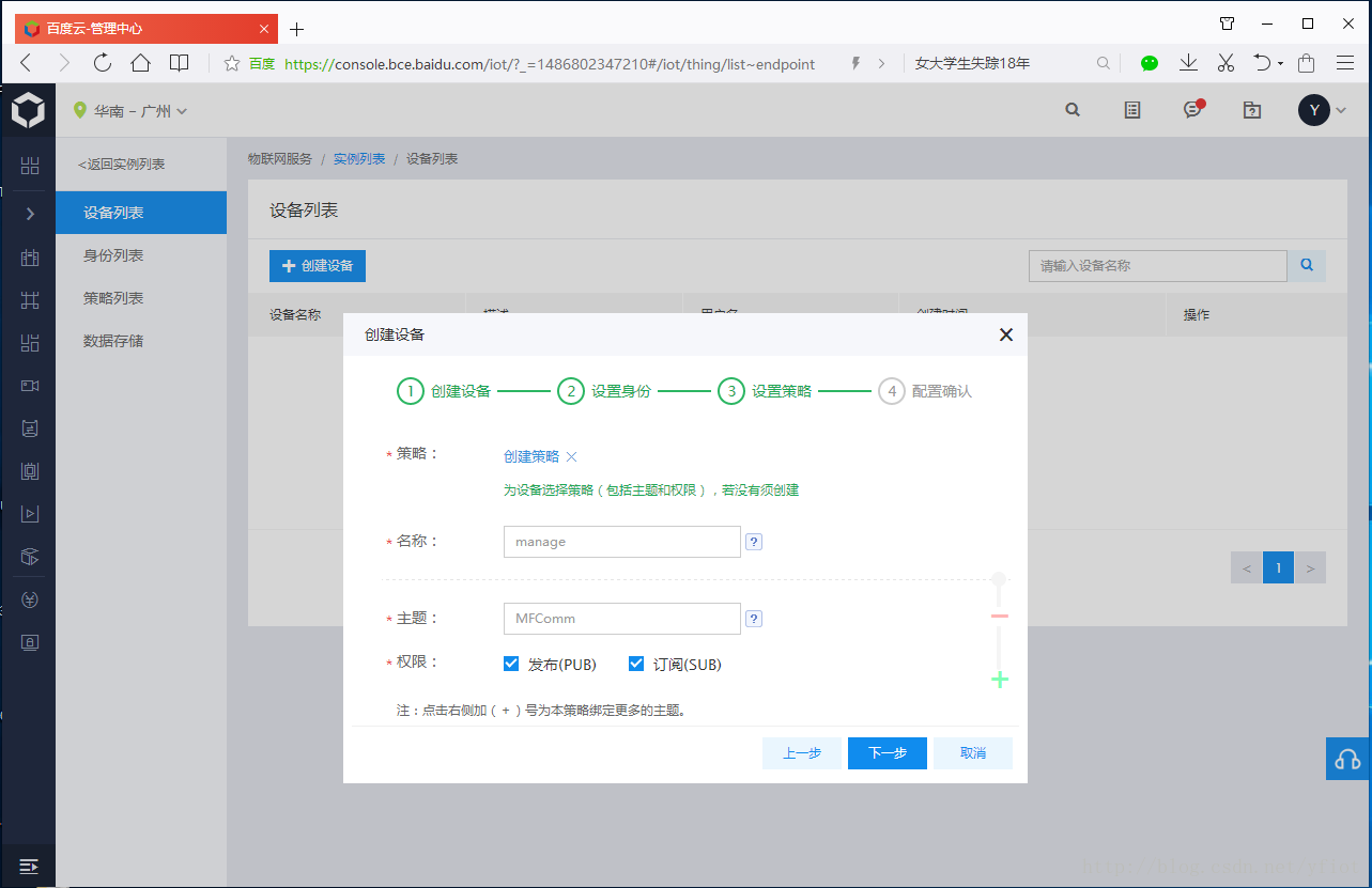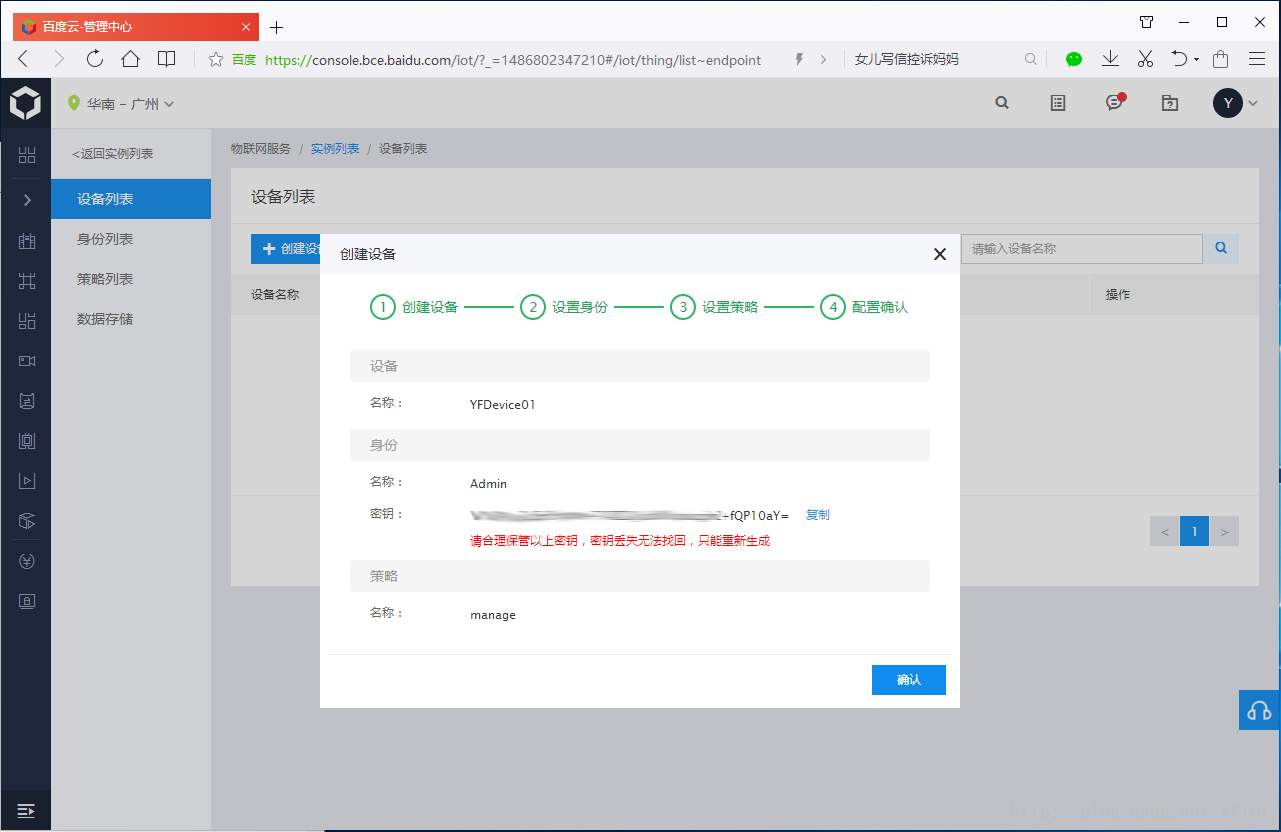 每个身份其实可以绑定若干个策略,每个策略对应若干个topic主题。和微软及阿里不同,百度的topic没有默认主题,这里我们创建一个相对通用的“yfiothub/yfdevice01/#”。也就是说这个节点下的所有topic都可以订阅也可以发布。