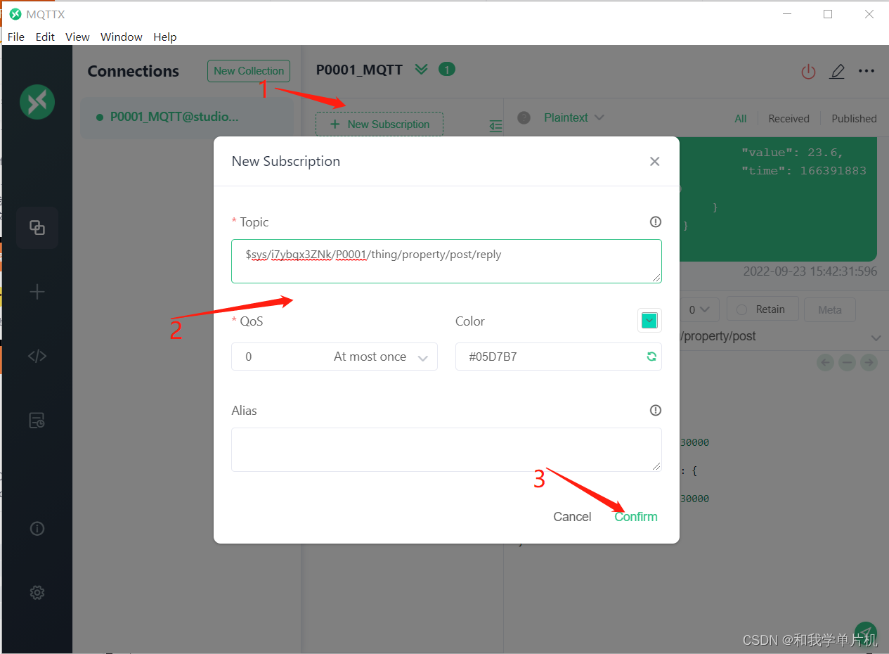 第八步 读取数据上报状态:订阅属性上报结果通知topic,就是获取设备上报数据后服务器返回的数据,这一步和第六步一样将 $sys/{pid}/{device-name}/thing/property/post/reply 按自己的设备名称及产品ID,如图22,从图22的1位置点击进入,在图22的2位置填写信息,点击点击图22的3号位置,