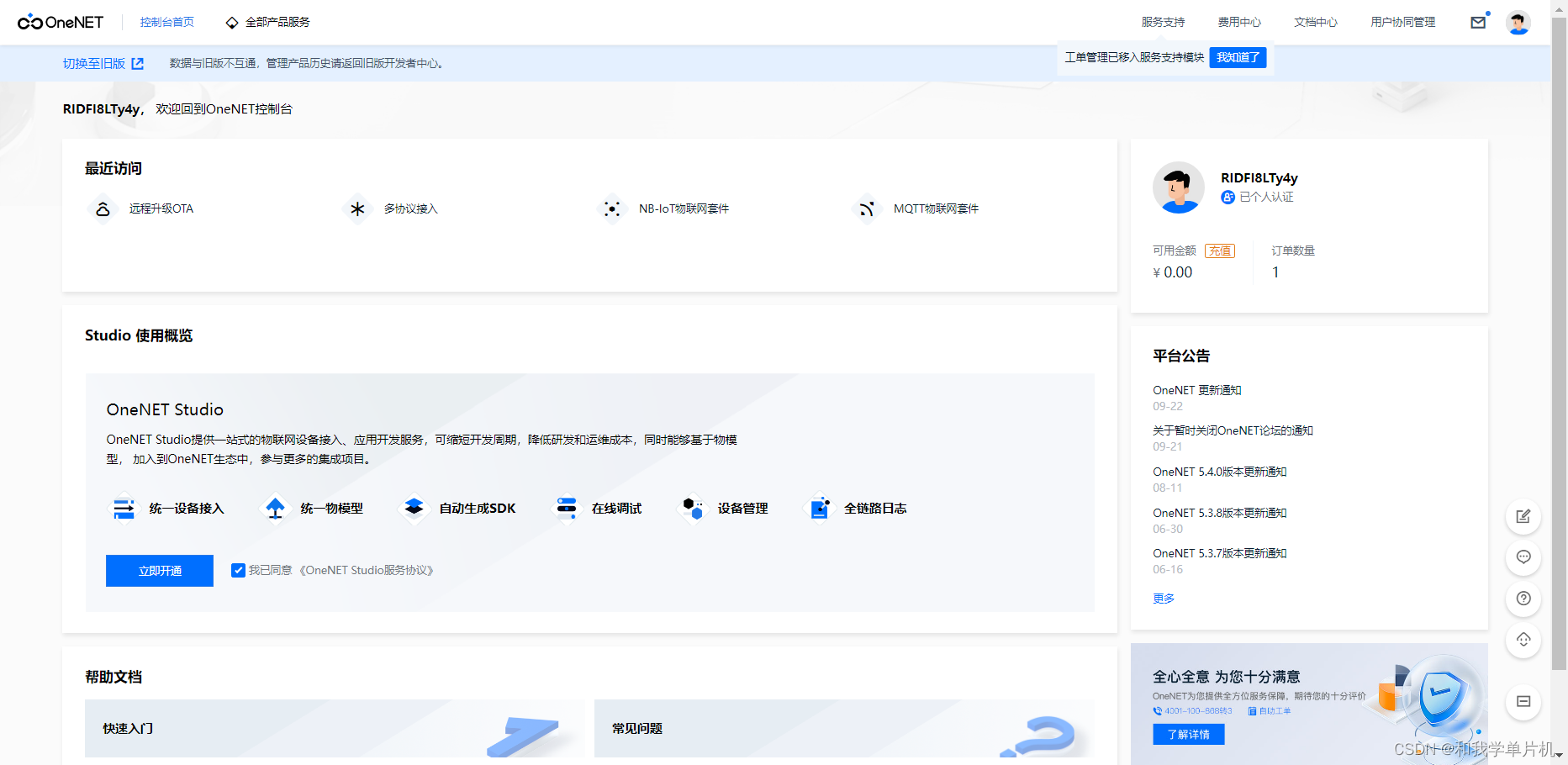 OneNET 云平台地址:https://open.iot.10086.cn/